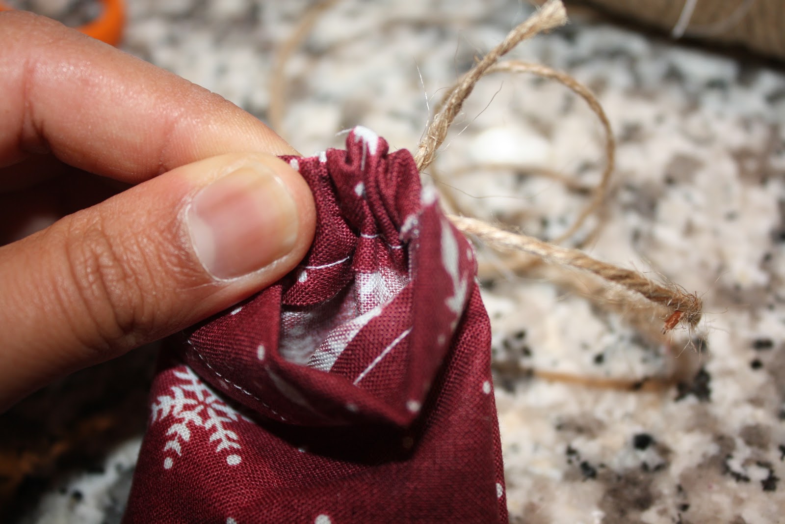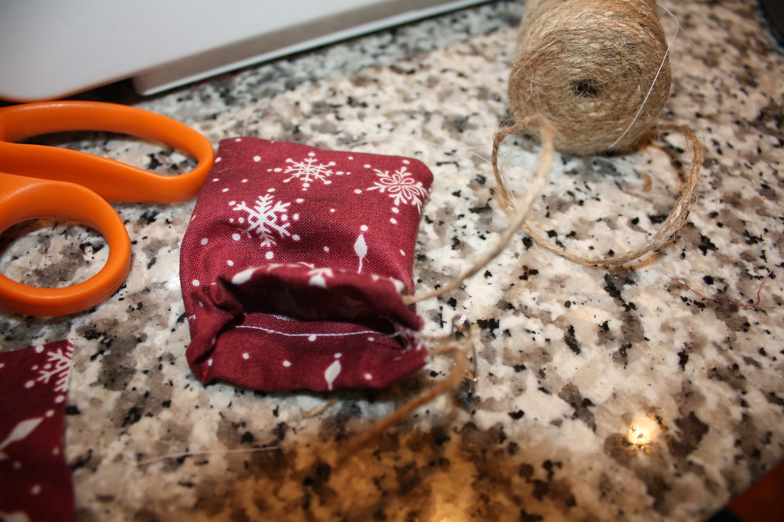 1.f. Pin a safety pin through the end of your ribbon (I used twine) and push it through one opening in the casing on the top of the bag. Work it through and pull it out the other end. Tie a knot with the two ends and you’re done with your bag! Make 24 of these (sounds like a lot, but it goes super fast once you have the fabric cut and you get into the rhythm).