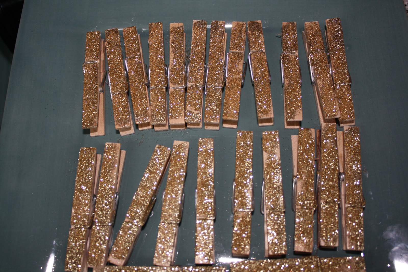 3.a. Paint your clothespins however you like. I painted them with regular craft glue and then sprinkled them with gold glitter. I’ll probably go back over them with some more glue so glitter doesn’t get eeeeeverywhere. I imagine that fancy stuff called Mod Podge I keep hearing about would work, as well.
