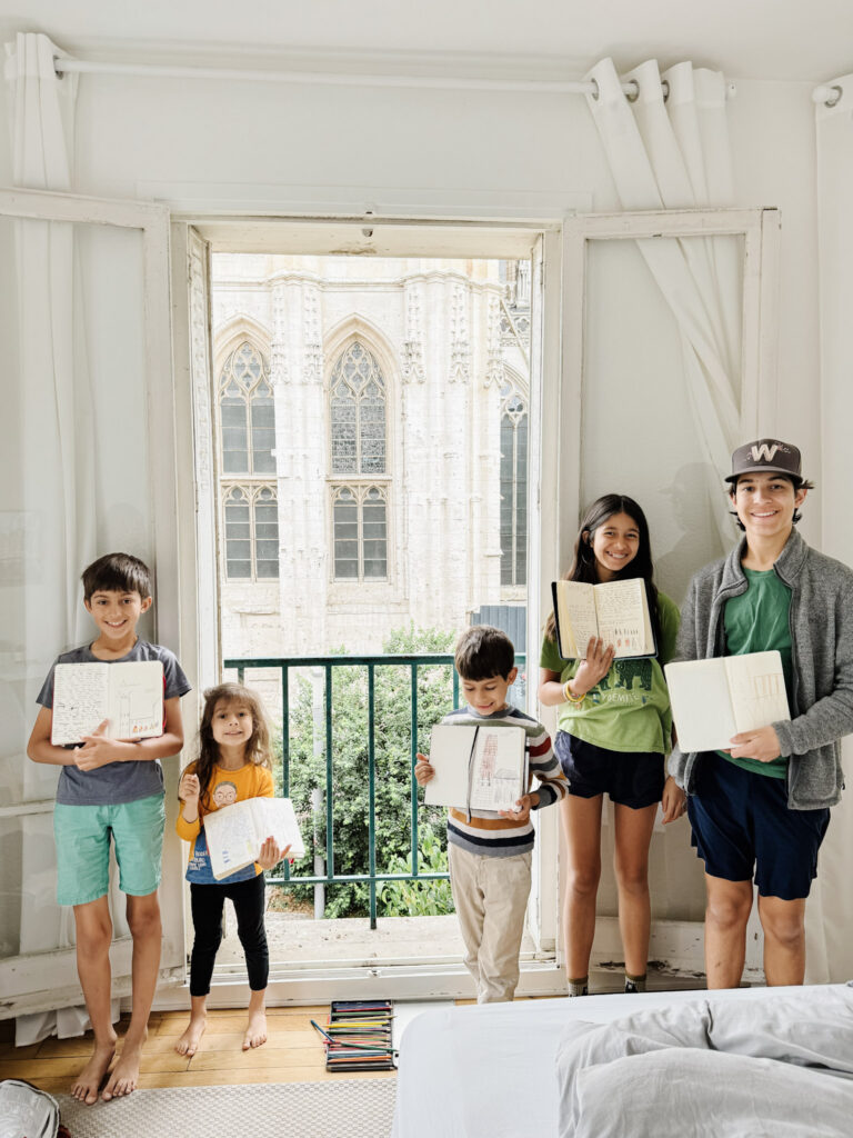 One of our favorite activities while visiting Rouen was to sketch the beautiful cathedral that Monet painted so many times. We had previously visited the Musee d’Orsay in Paris that houses several of these paintings so our older kids remembered seeing it, and we showed images of several of the paintings to all our kids to spark their imaginations. Then we pulled out their travel journals, some colored pencils, and let them go to town creating their own versions.